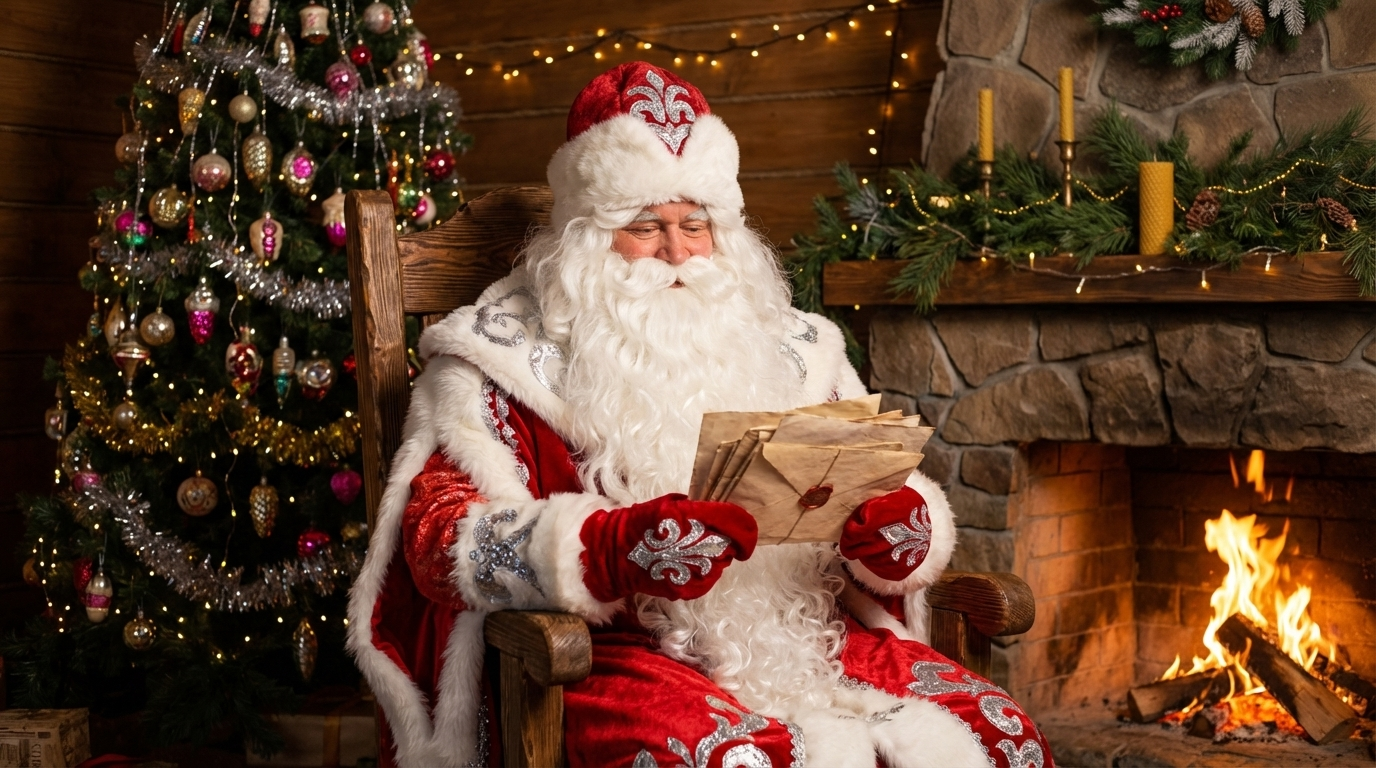 A hyperrealistic portrait of Ded Moroz in his traditional fur costume sitting in a large wooden izba next to a crackling fireplace, holding letters in his hands. His beard is long and white, his eyes are warm and twinkling with kindness. The background features a New Year's tree adorned with garlands and vintage Soviet ornaments. The room is decorated with pine branches, candles, and strings of lights, creating an atmosphere of cozy warmth. Soft, natural lighting from the fireplace casts gentle shadows on his face and clothing, highlighting the textures of his fur coat and the letters he holds. Shot with a 50mm lens at f/2.8, ISO 400, capturing the intimate details and the serene ambiance of the scene.